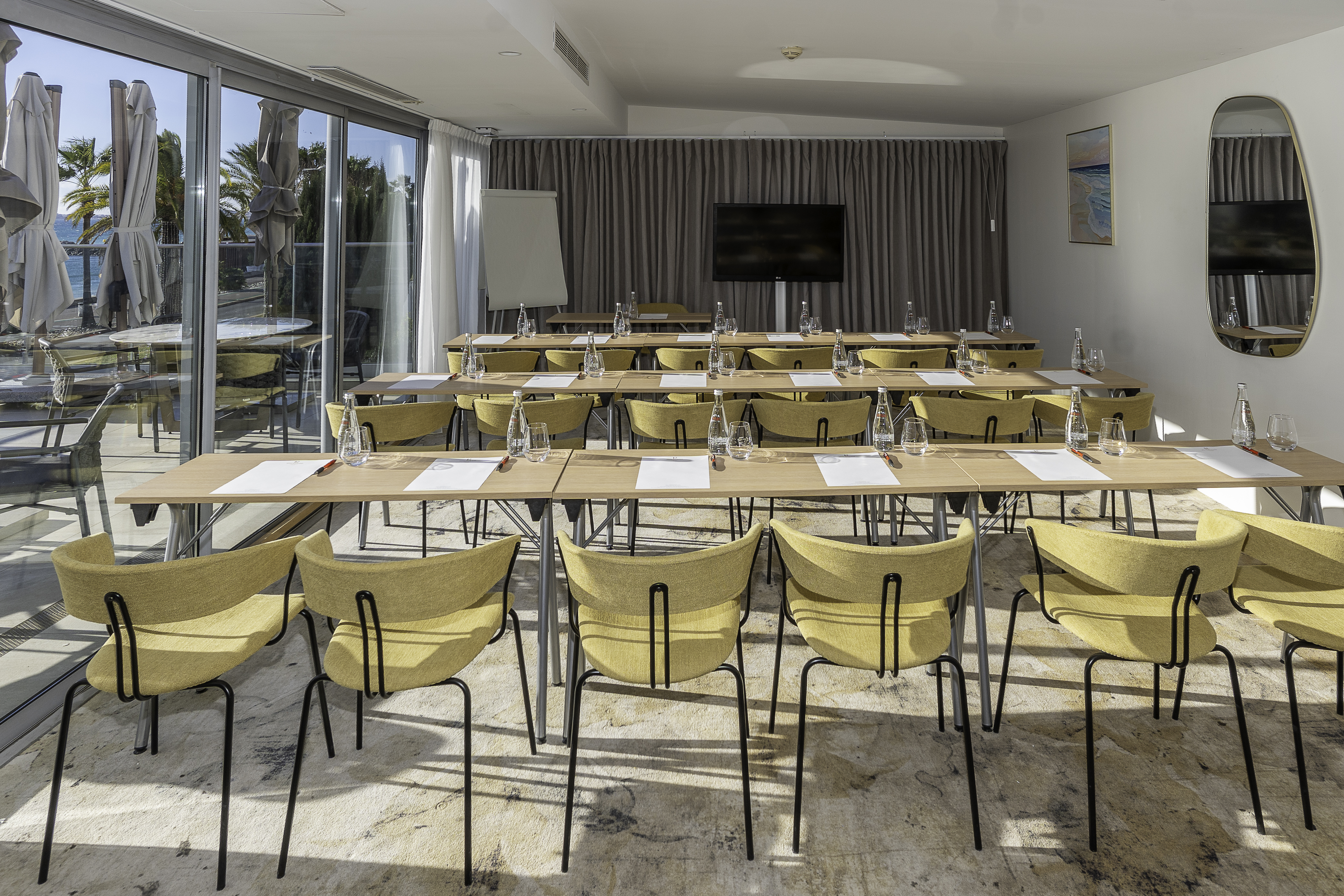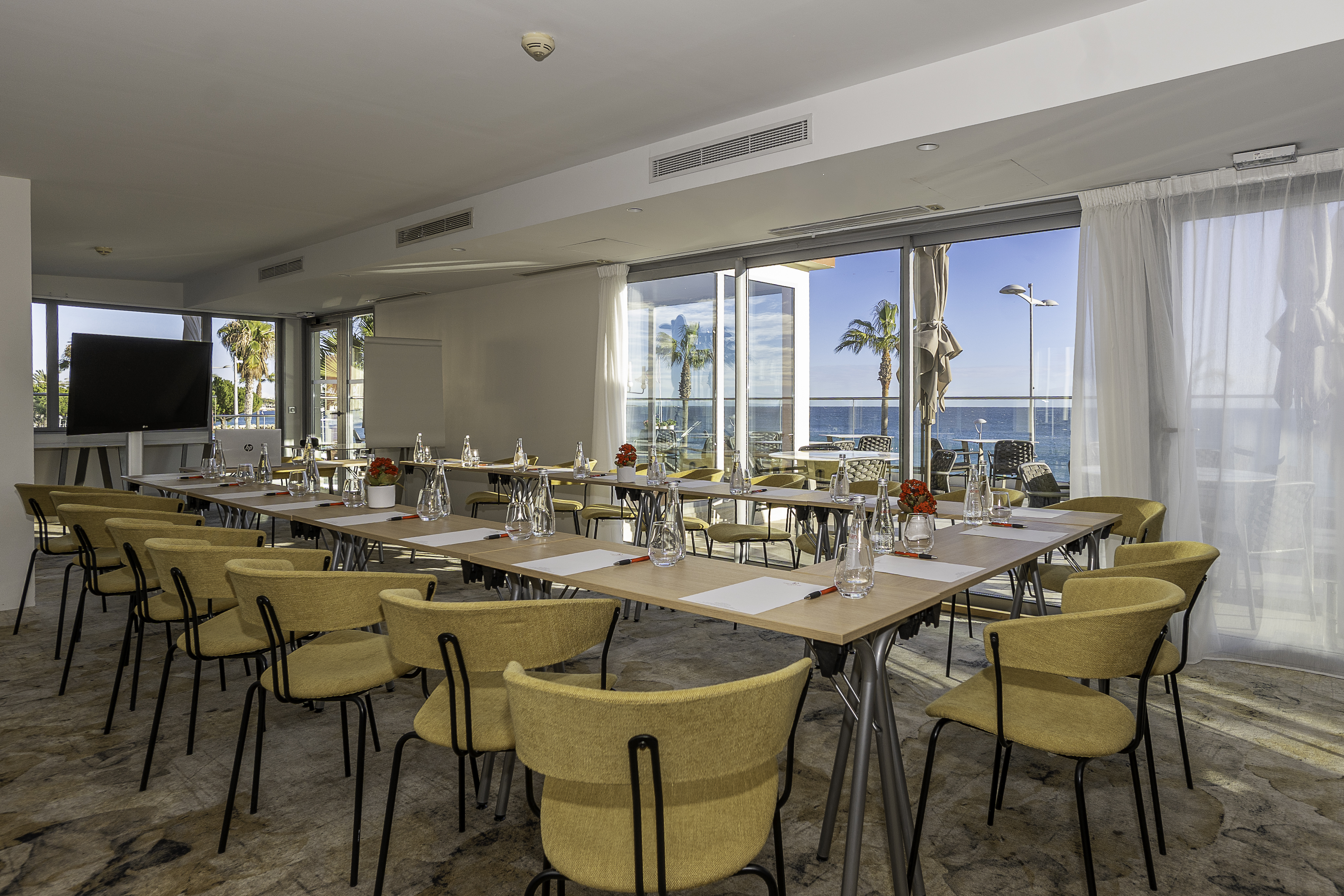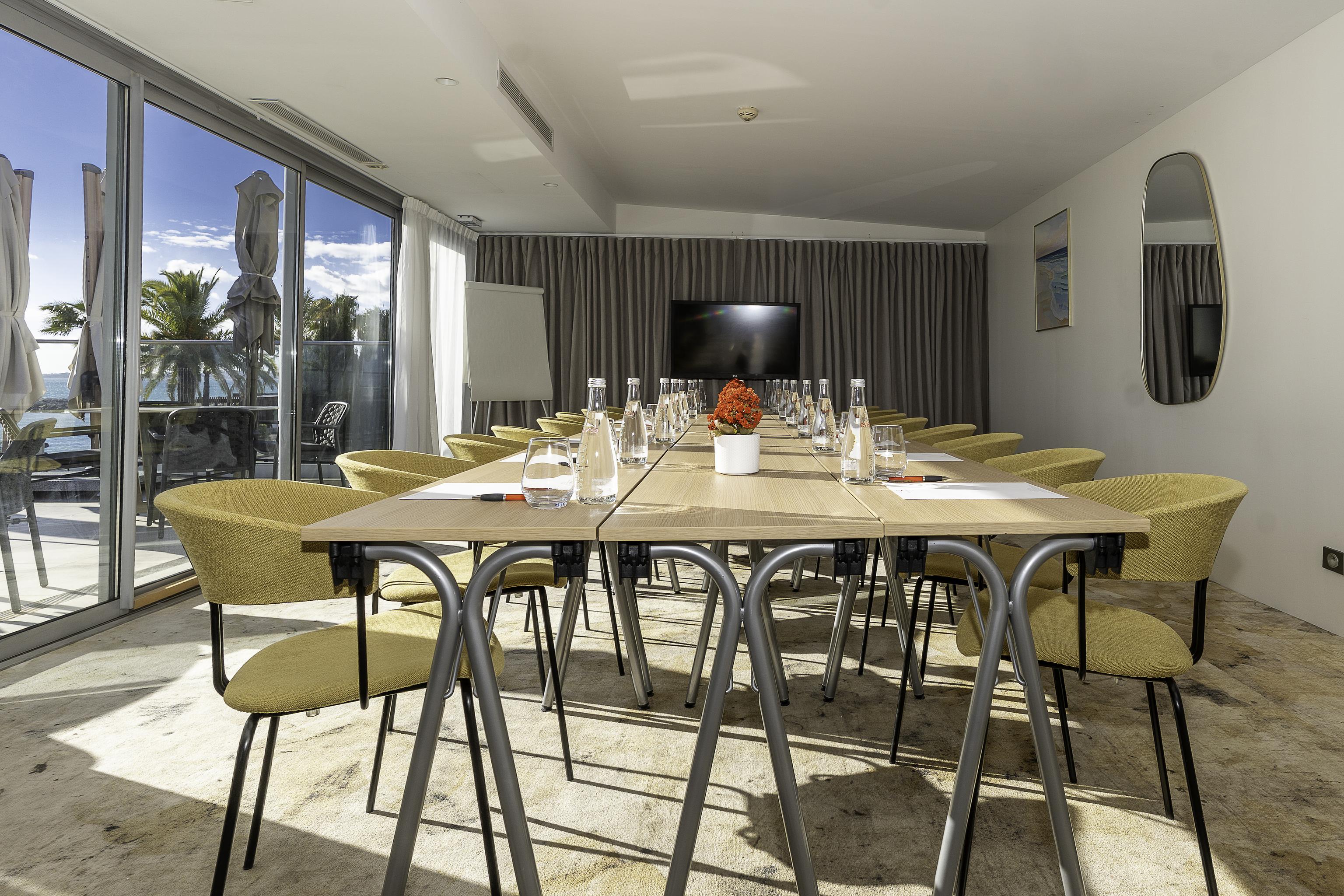 À 10 minutes de l'aéroport de Nice, l'Hôtel Royalmar à Cagnes-sur-Mer vous accueille dans un cadre idéal pour vos séjours d'affaires. Profitez de notre salle de réunion lumineuses et équipées, d'une connexion wifi haut débit, ainsi que d'espaces élégants et chaleureux, parfaitement adaptés pour travailler, échanger et se détendre après une journée productive face à la mer Méditerranée.