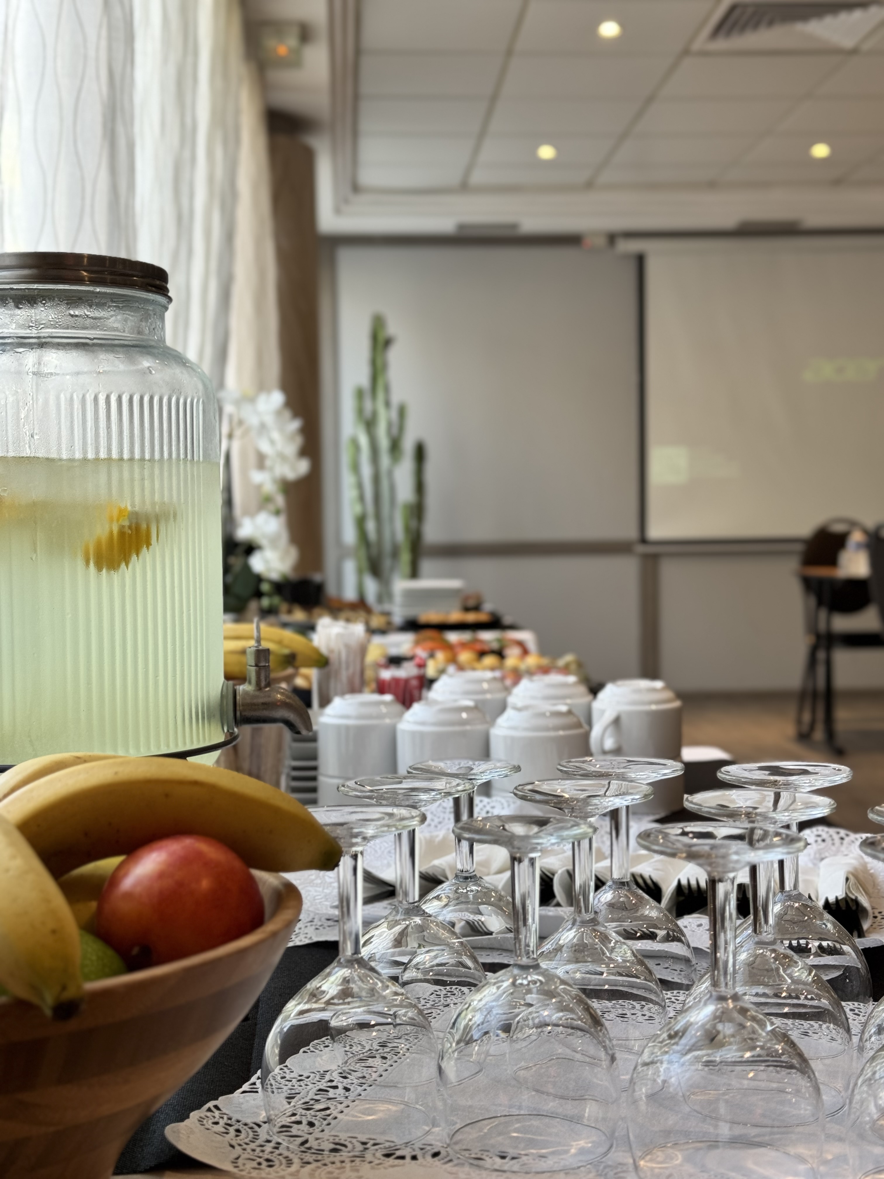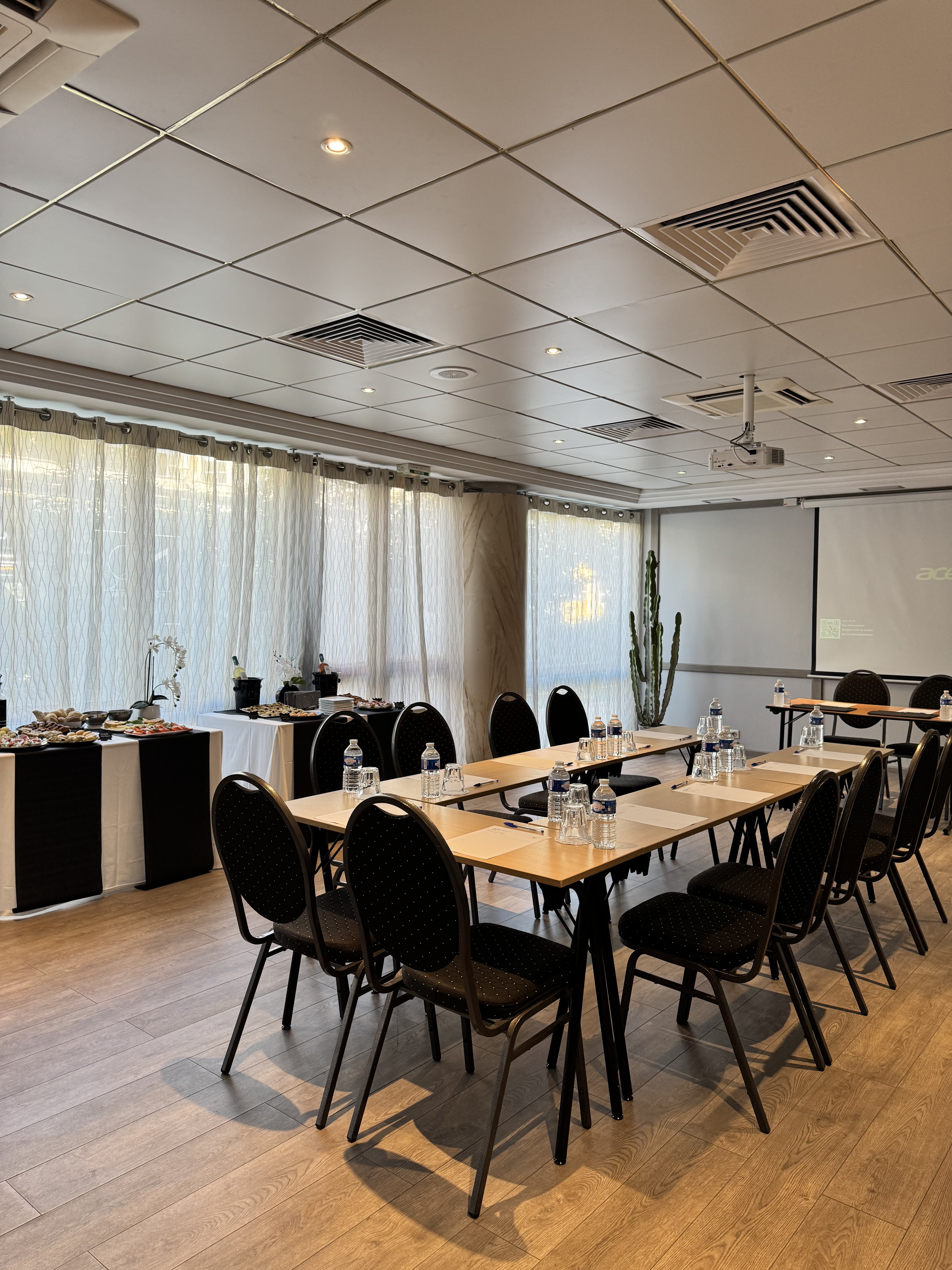 - Équipement : Vidéoprojecteur Paper board Ecran Wifi dans la salle Tables Chaises Climatisation Tables rectangulaires Fourniture de bureau Photocopieur Personnel d'accueil